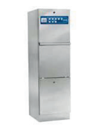 Am Boden montiertes Gerät mit Sockel, auf dem eine Arbeitsplatte angebracht ist. Ablaufanschluss an der Wand oder am Boden mit Geruchsverschluss. Thermische Desinfektion mit eingebautem Dampfgenerator.